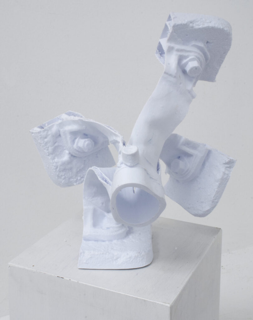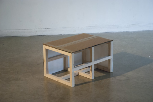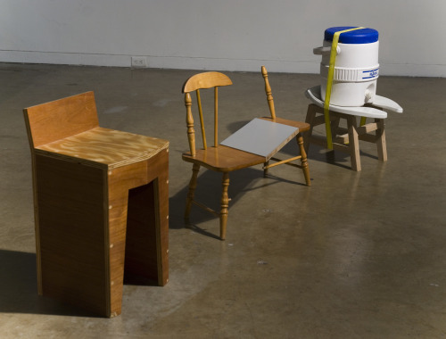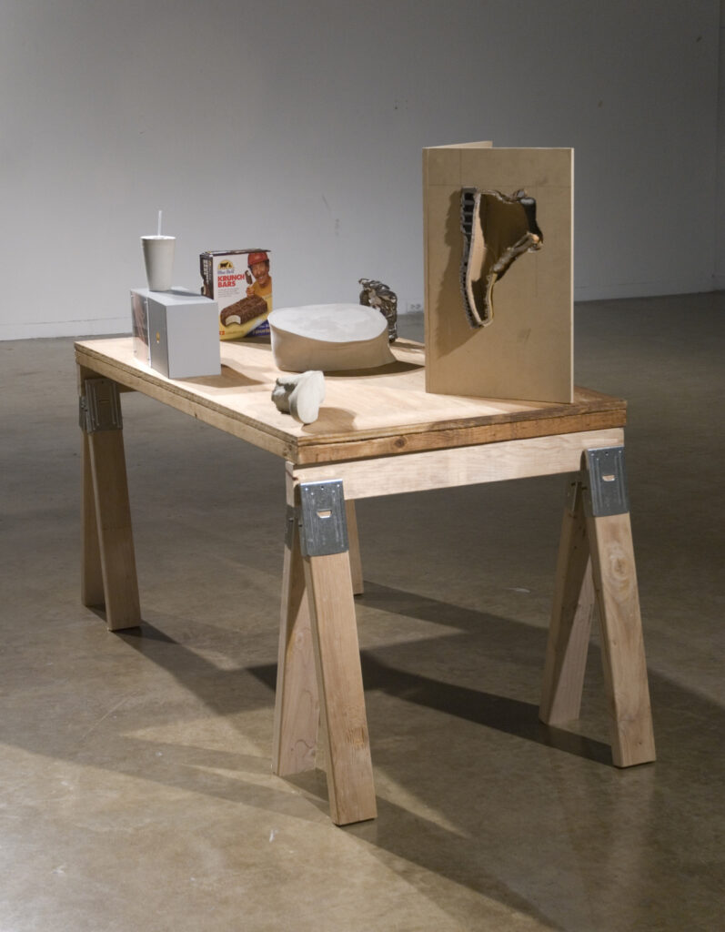 Saw horses, Pine, Plywood, Melamine, MDF, Boot, Cement, Plastic Straw, Inkjet print, Plexiglas, Gold leaf, Plaster, Paste wax, Bronze, Ceramic shell, Ice cream box, Polystyrene, Oil, Hardware