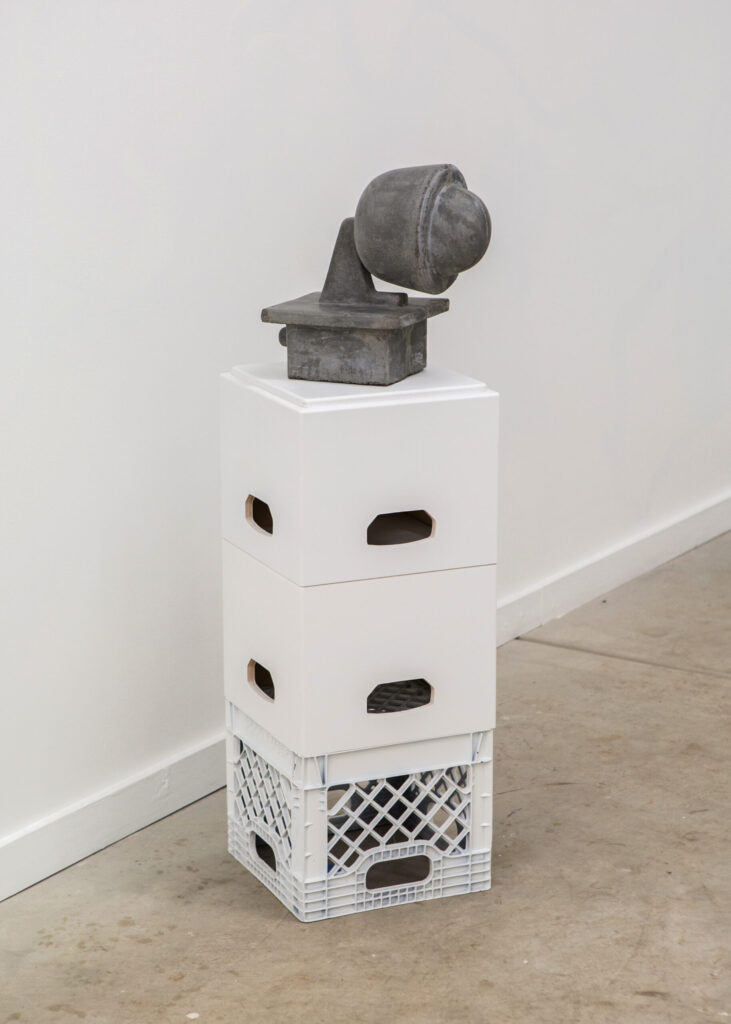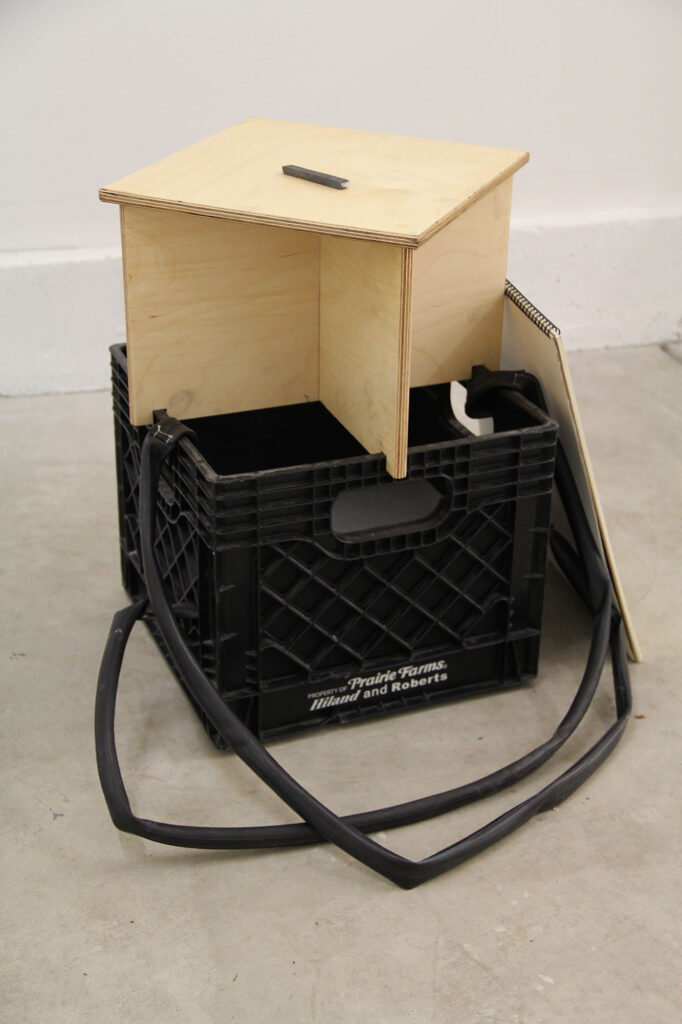 Found milk crate, plywood, plexiglass, masonite, lens, bike inner tubes